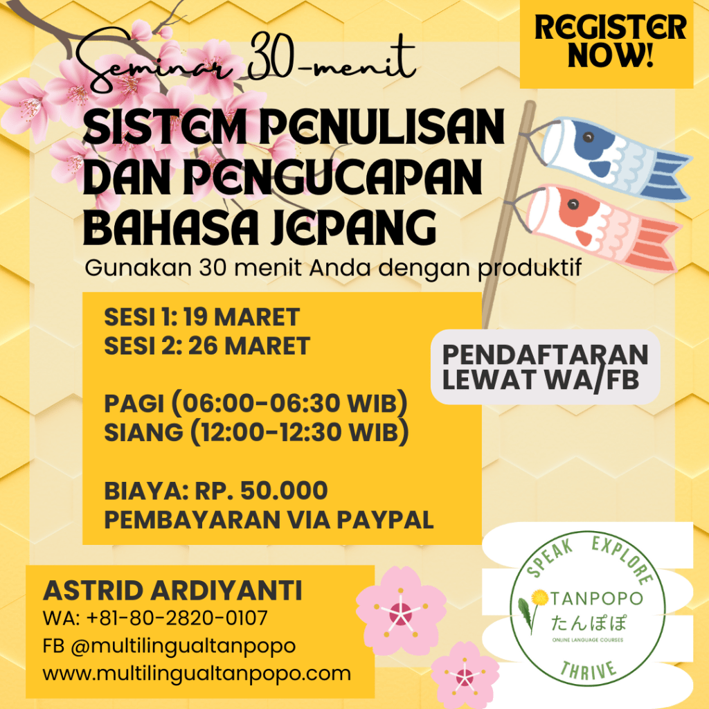 Apakah Anda tertarik untuk mengenal sistem penulisan dan pengucapan bahasa Jepang? Silahkan bergabung di seminar 30-menit saya di Zoom. Seminar ini bisa Anda ikuti di pagi hari sebelum Anda mulai rutinitas sehari-hari atau di jam istirahat siang. Gunakan waktu Anda dengan produktif untuk meningkatkan skill bahasa Anda.