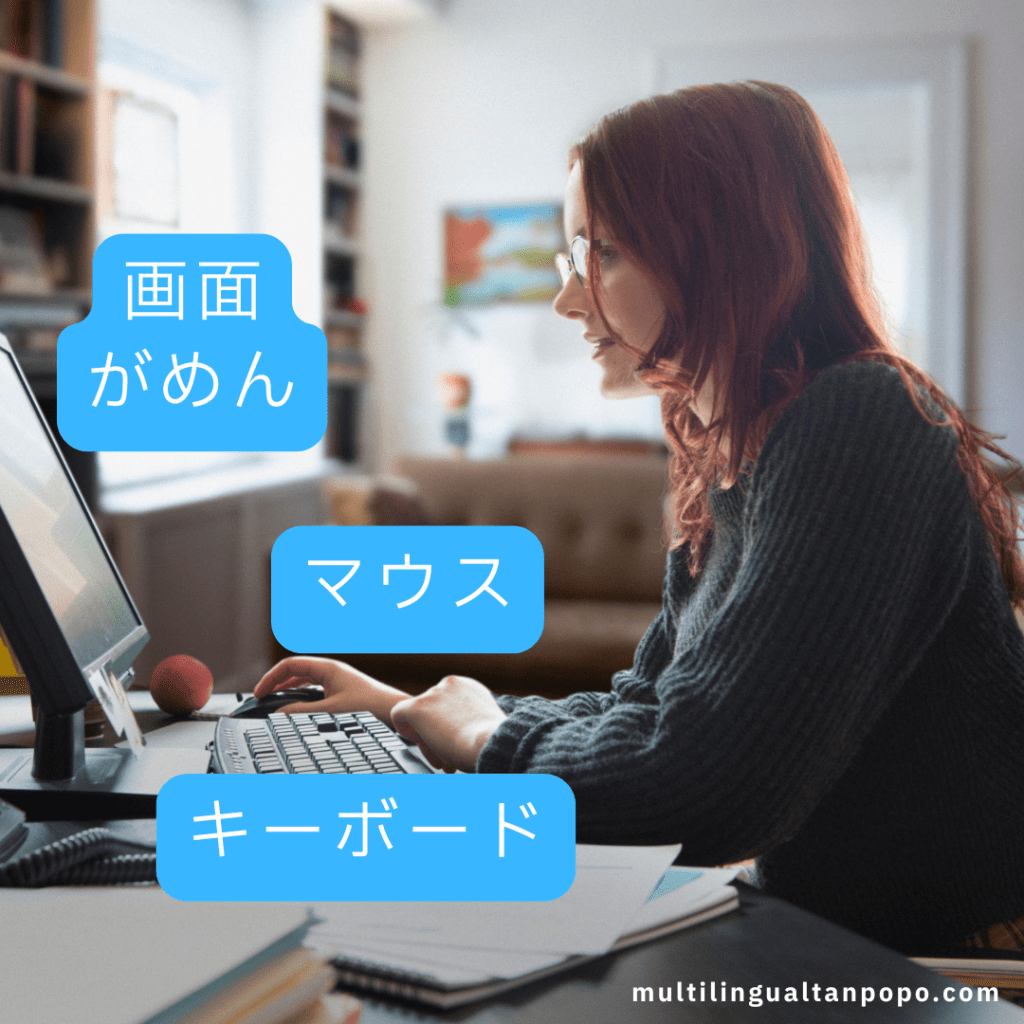 From the personal computer(パソコン)on your desk and the screen(画面 がめん)you read from,